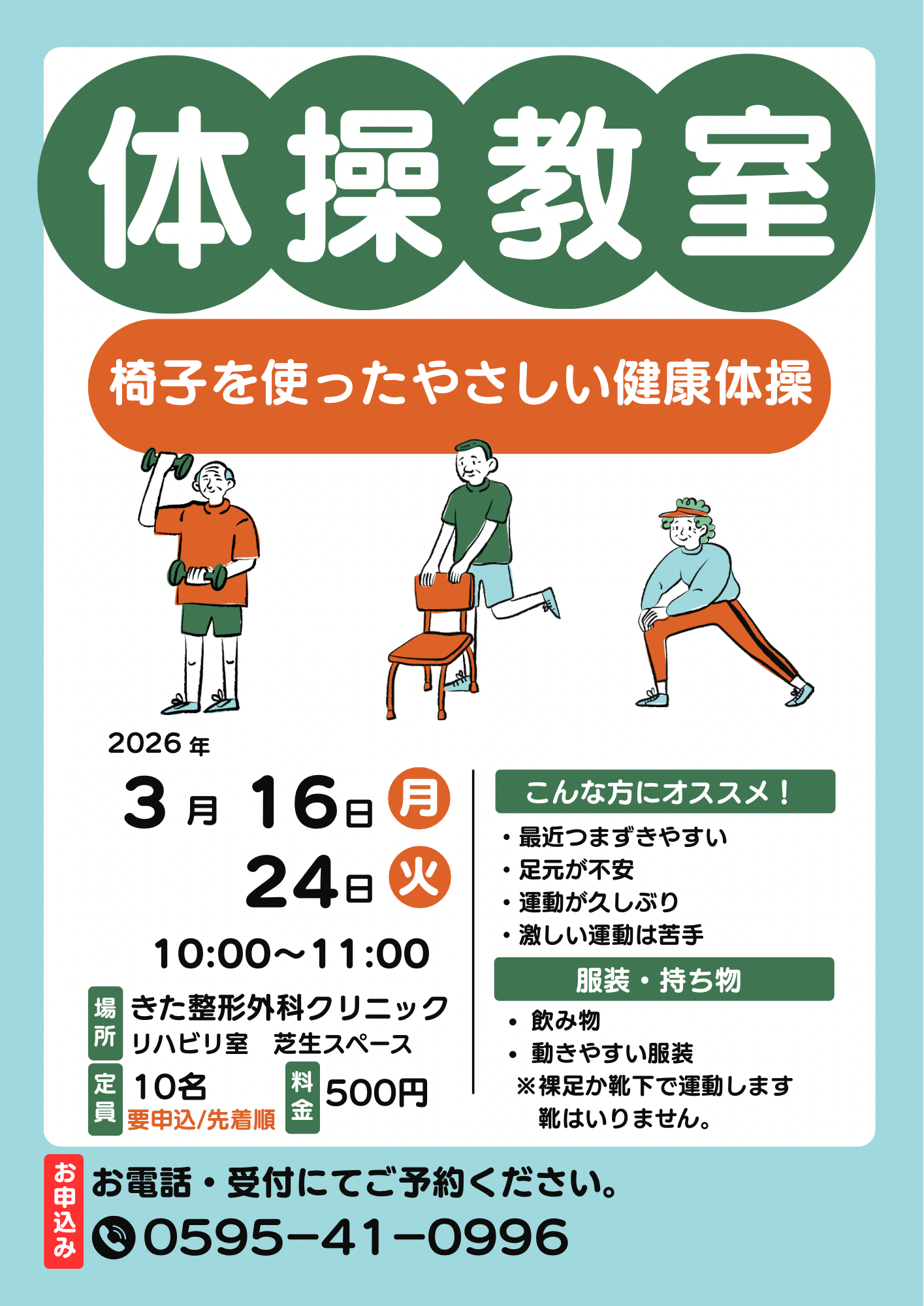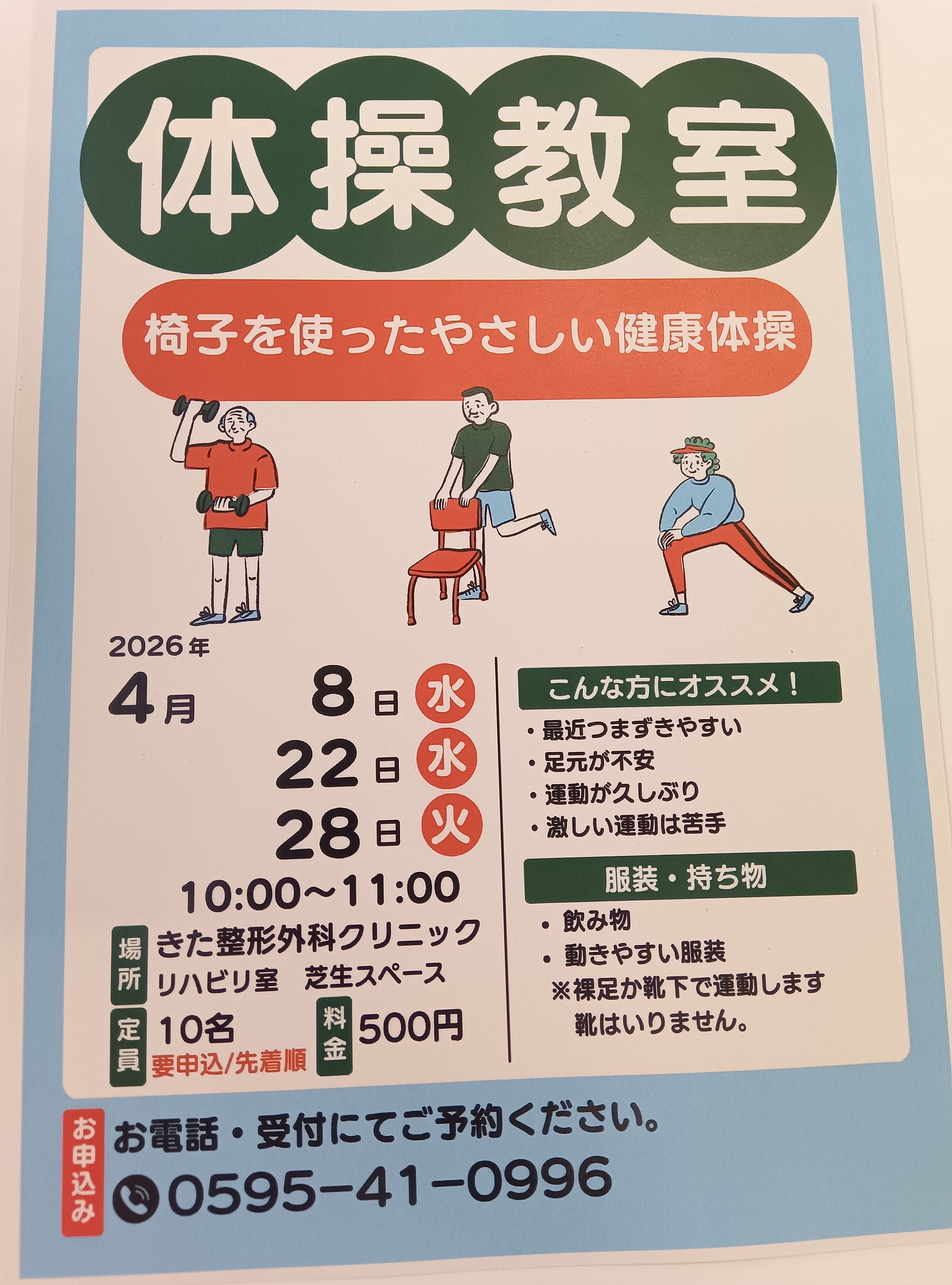 きた整形外科クリニックでは、転倒予防のための体操教室をはじめさせていただきます。