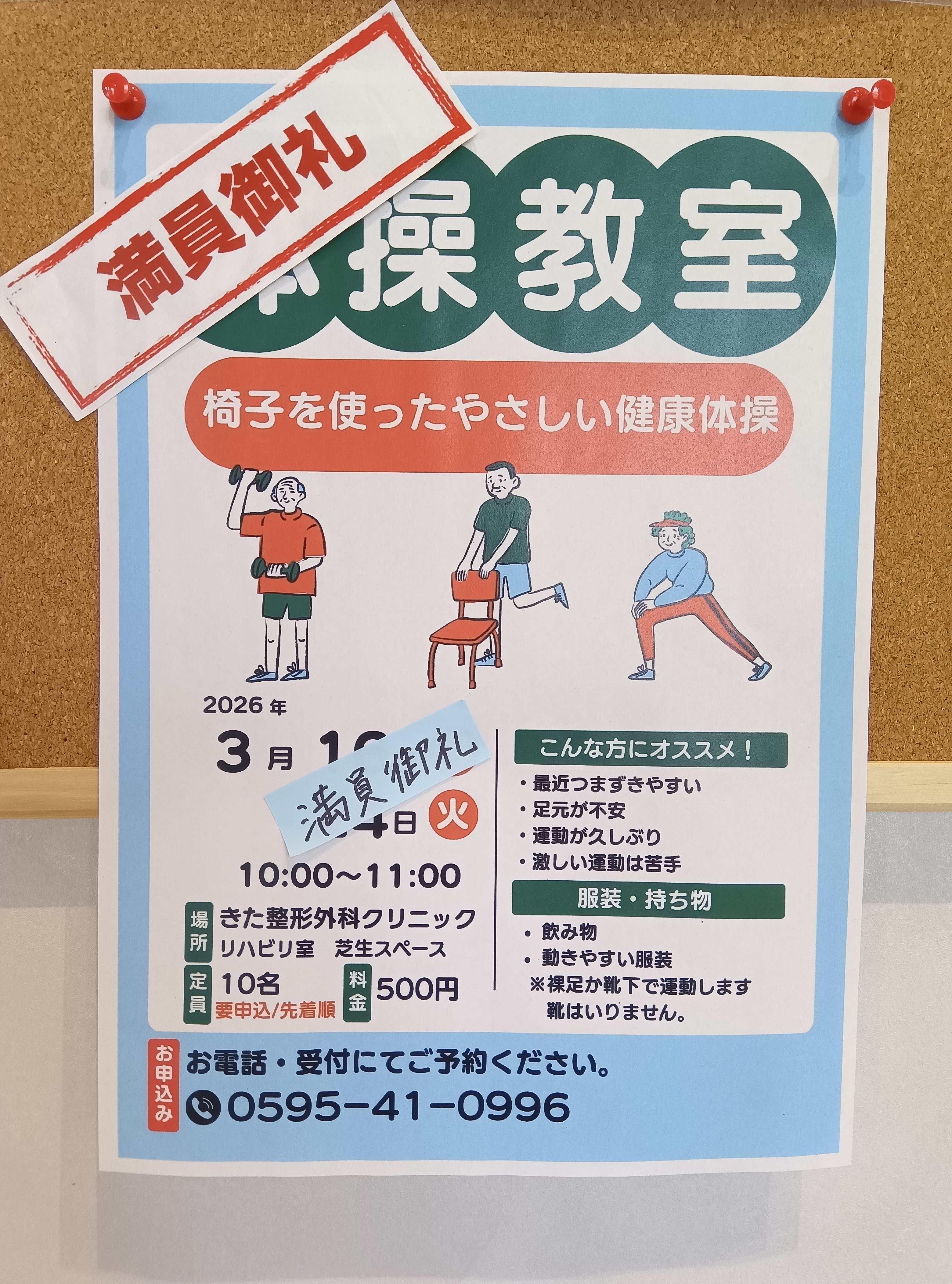 ありがたいことに3月16日(月)、24日(火)の体操教室の予約がすべて埋まりましたので、受付を終了させていただきます。